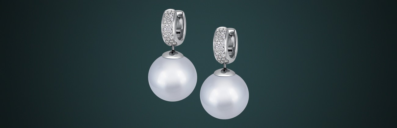 Серьги из белого золота с белым морским жемчугом AKOYA и вставками бриллиантов с-210651-бб